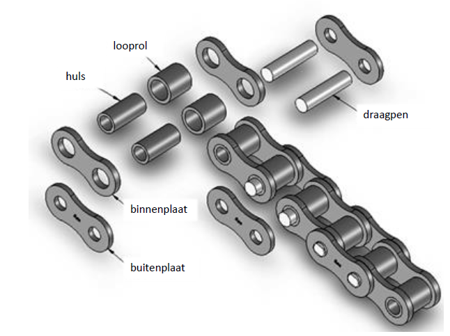 De ketting zelf bestaat uit scharnierende delen die verbonden zijn door pennen. Deze pennen vallen in de inkepingen van het blad en brengen de kracht over.